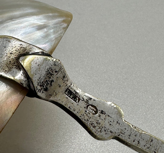 Antique Large Mother of Pearl Spoon – Ornate Design, Worn Silver-Plated Handle