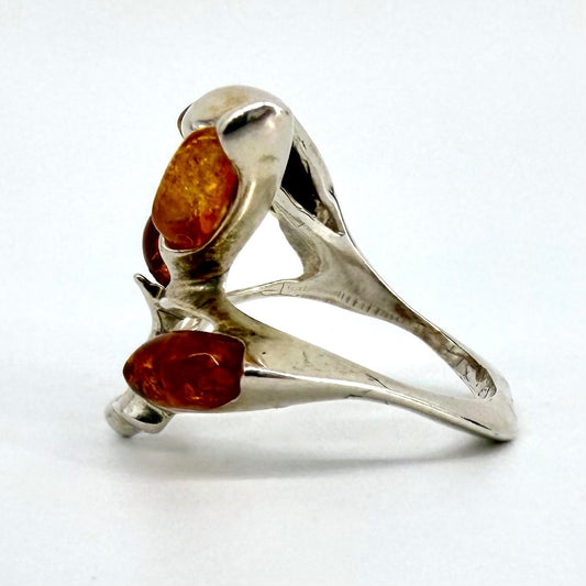 Vintage Baltic Amber & Silver Ring – Brutalist Polish Design – UK Size O½