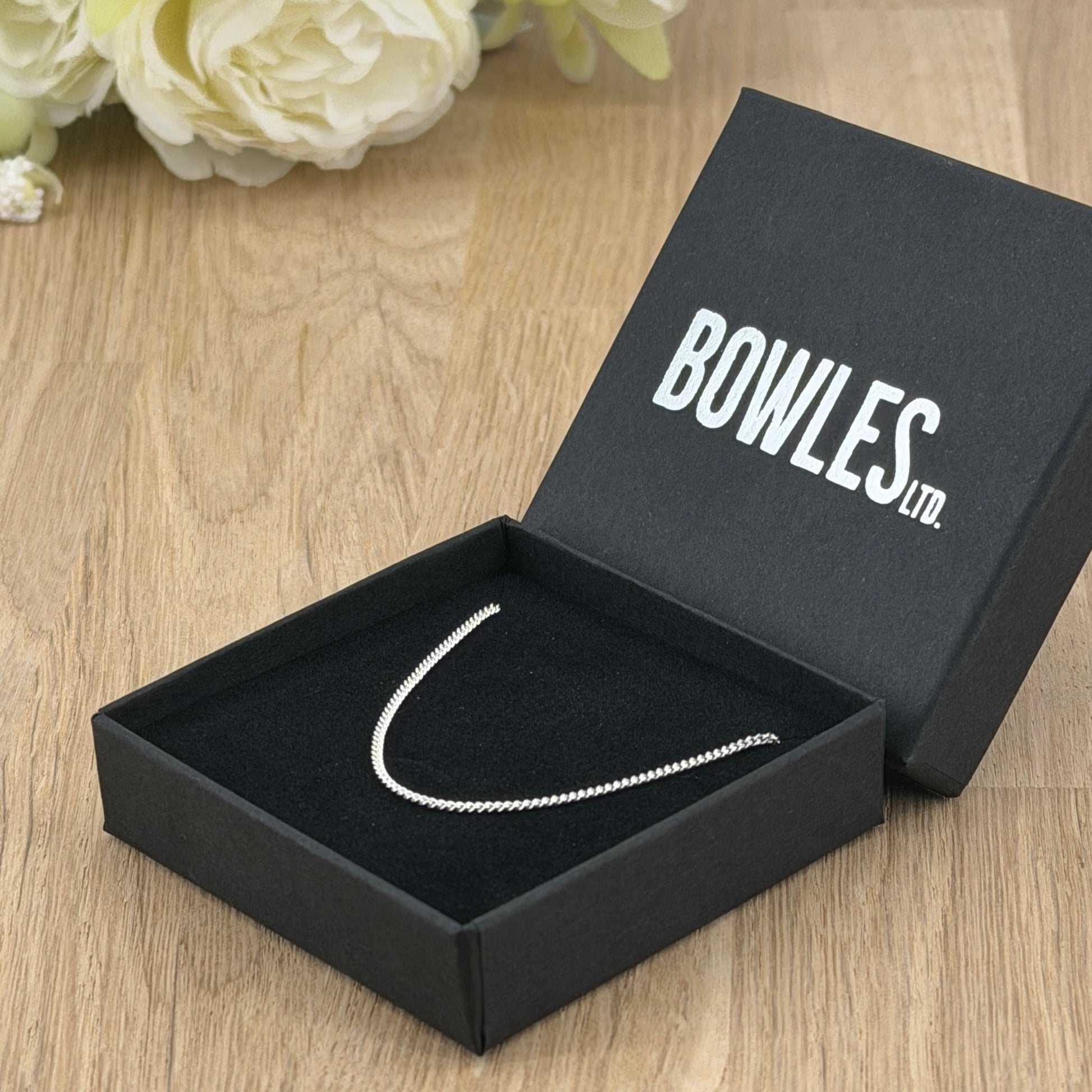 A brand new 925 sterling silver curb chain necklace, featuring classic flat interlocking links that sit neatly and comfortably against the skin. This timeless design offers a clean, understated look — ideal worn alone for everyday elegance or paired with a pendant. Supplied in a Bowles Ltd gift box, ready for gifting.