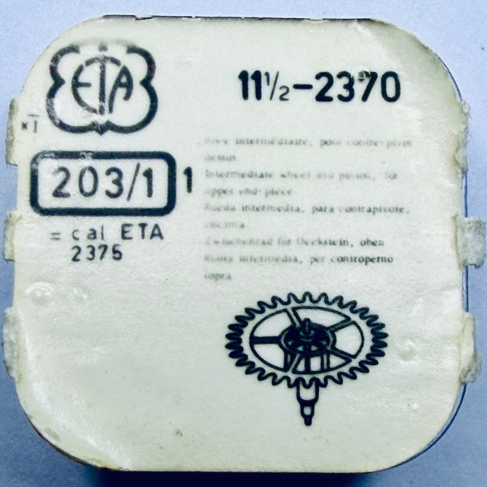 Genuine vintage new old stock ETA Intermediate Train Wheel (203/1) for mechanical watch movements. Supplied in original packaging and suitable for the calibres listed below. Ideal for professional watchmakers, restorers and vintage watch repair projects.