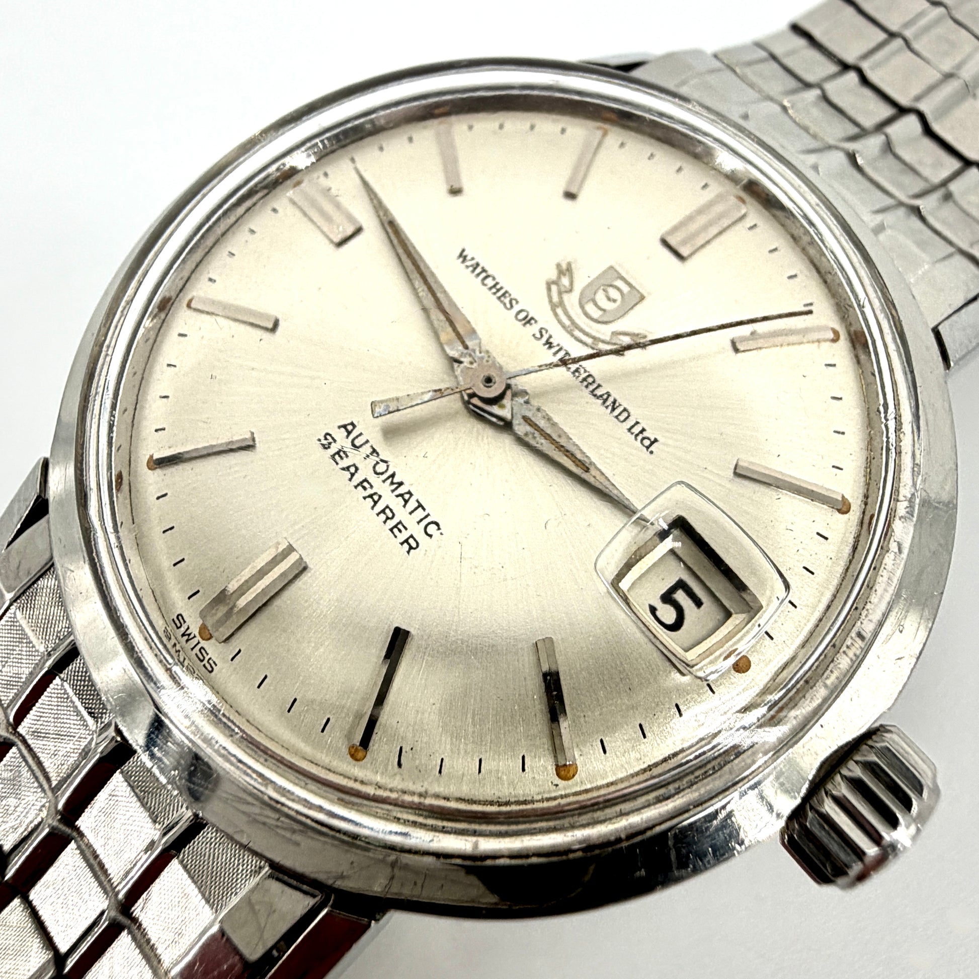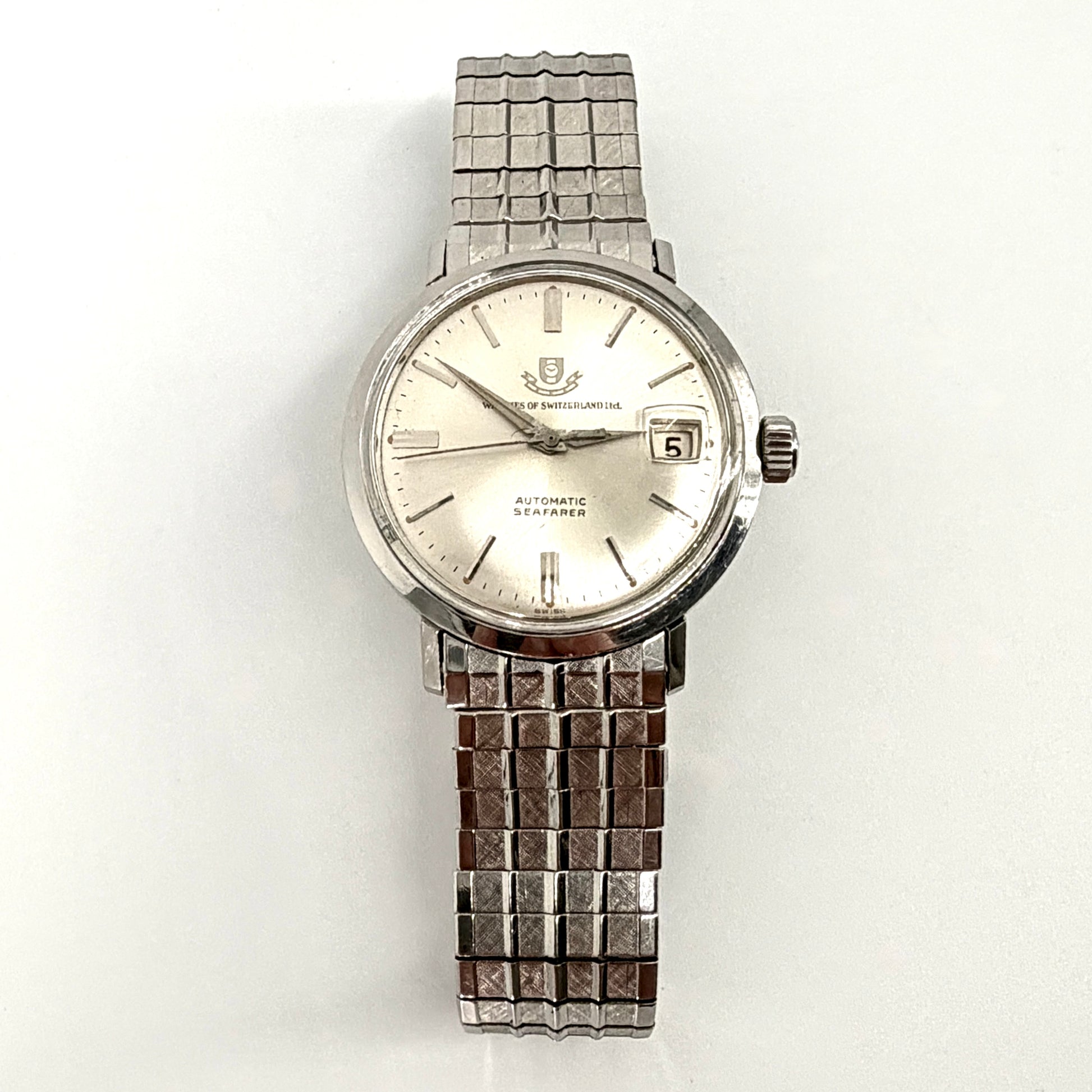 A handsome vintage Swiss automatic wristwatch by Watches of Switzerland Ltd, model “Seafarer”, dating to circa 1960s. This classic dress watch features a clean silver sunburst dial with applied batons, date window at 3 o’clock, and is powered by a Swiss-made automatic movement. Housed in a stainless steel compressor case and fitted with its original JB Champion stainless steel bracelet.